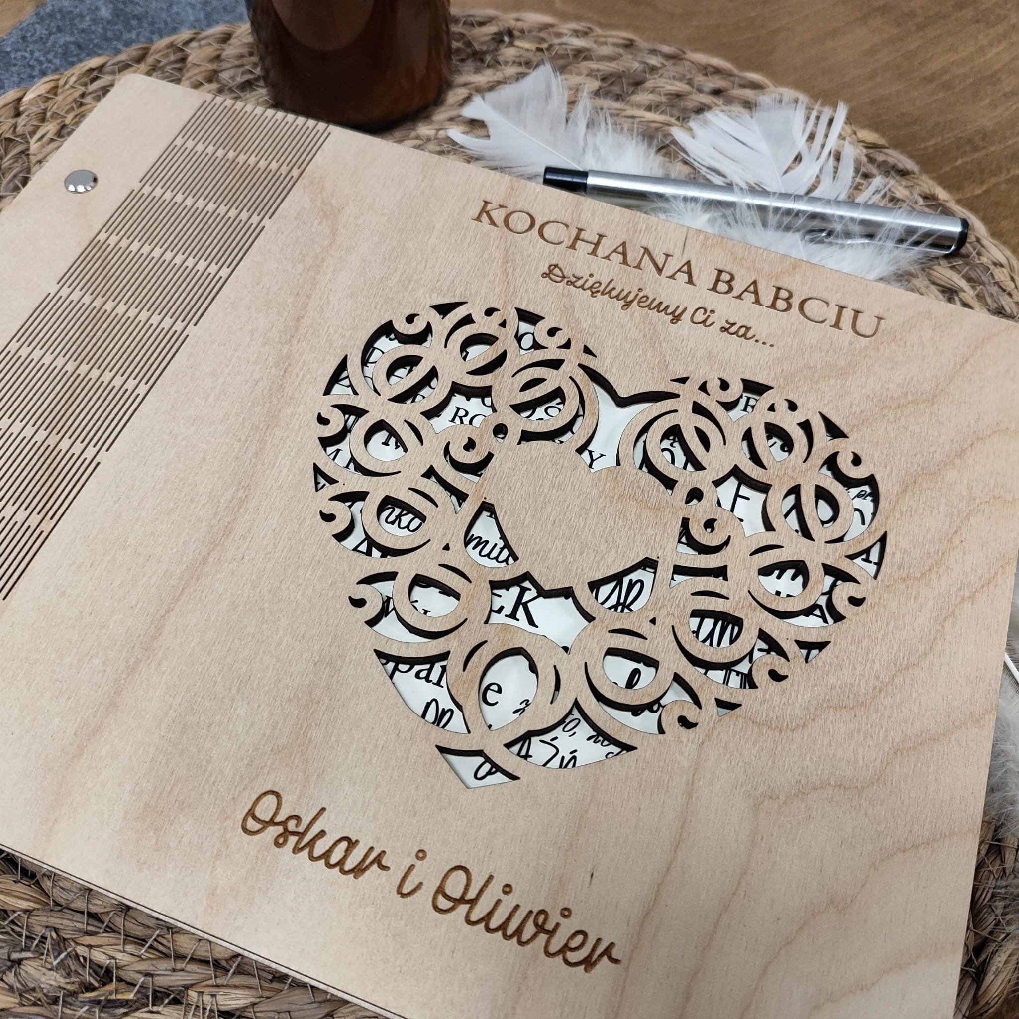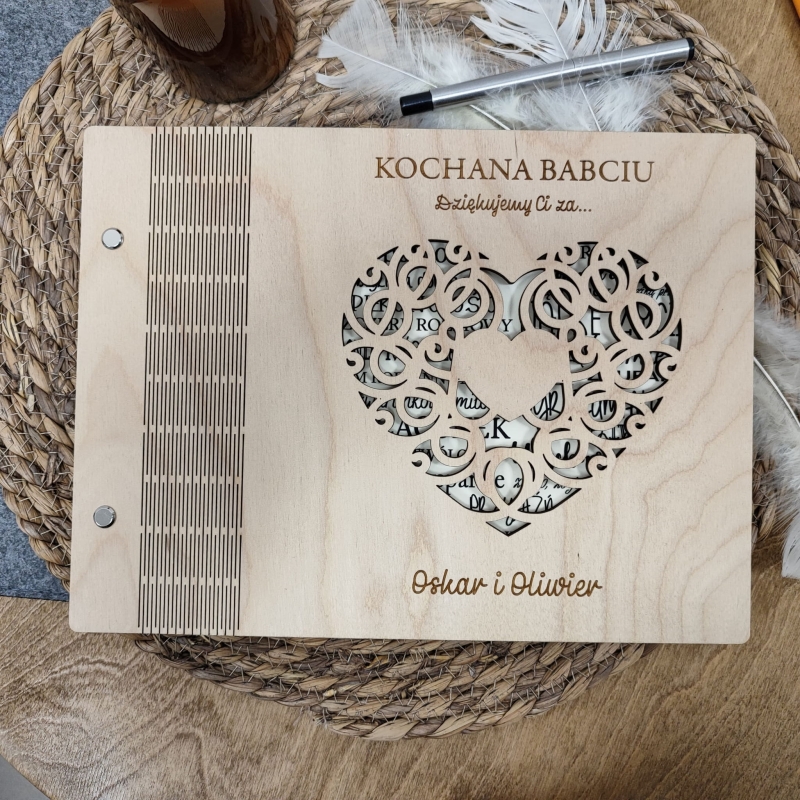 Okładka albumu wykonana jest ze sklejki brzozowej. Posiada ona specjalne nacięcia, które pozwalają na jej prawie całkowite rozłożenie. Na okładce znajduje się personalizowany grawer oraz ażurowe serce.